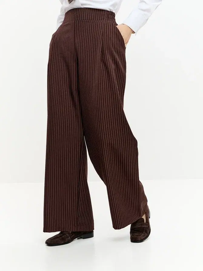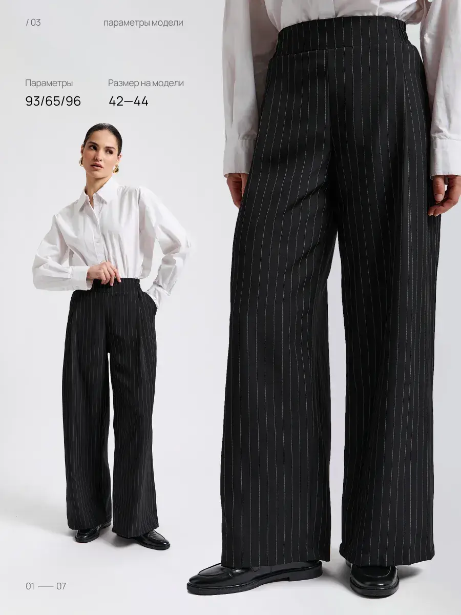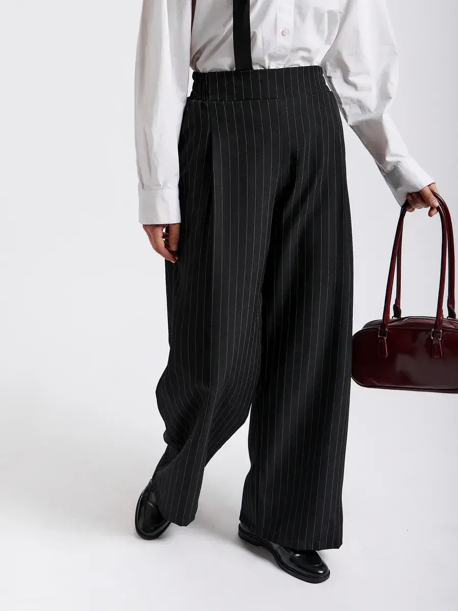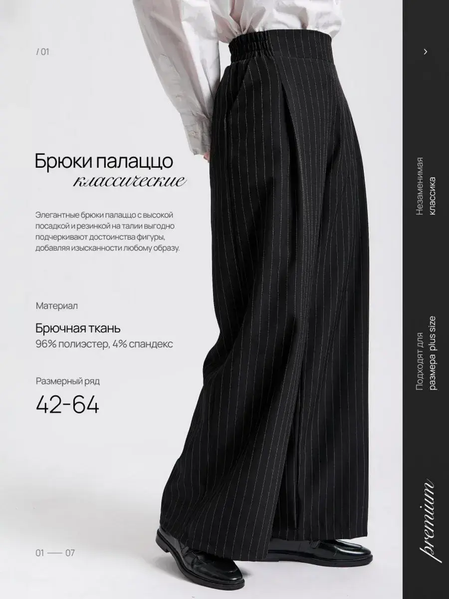 Представляем вашему вниманию элегантные женские брюки палаццо. Вы долго просили вернуть брюки палаццо женские в продажу, и мы с радостью сообщаем, что мы готовы представить вам новую модель из брючной ткани. Классические женские брюки – идеальный выбор для стильной женщины, ценящей комфорт и элегантность. Модель выполнена в универсальном черном цвете в полоску, который гармонично впишется в гардероб на любую осень. Эти легкие брюки клеш подойдут как для высоких, так и для невысоких женщин, для женщин больших размеров , на полных женщин плюс сайз (plus size). Брюки палаццо женские на осень подходят для осенних прогулок, офиса и повседневной носки. Благодаря фасону палаццо и широкие штанинам изделие визуально вытягивает силуэт и скрывает недостатки фигуры, а пояс на резинке обеспечивает отличную посадку и удобство даже для больших размеров и беременным. Практичный фасон штаны-клеш выгодно подчеркнет достоинства любой фигуры и добавит изысканности образу. Модель создана с учетом последних трендов, а продуманная конструкция обеспечивает долгий срок службы. брюки палаццо женские на резинке осенние идеальный выбор для офиса, похода на свидание или незабываемых осенних прогулок. Эти брюки палаццо женские на резинке станут отличным дополнением к осеннему гардеробу. Универсальность, практичность и актуальный дизайн делают их выгодным решением для тех, кто ищет комфорт и стиль в одном изделии. Брюки женские паллацо оверсайз идеально сочетаются с различной обувью и верхней одеждой, что позволяет создавать разнообразные образы на каждый день и для особых случаев. Спасибо за выбор нашего бренда! Мы продолжим вас радовать нашими новинками!