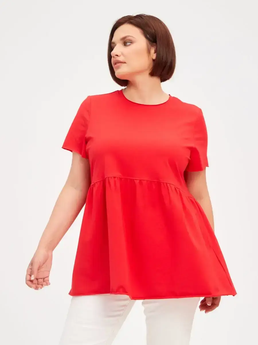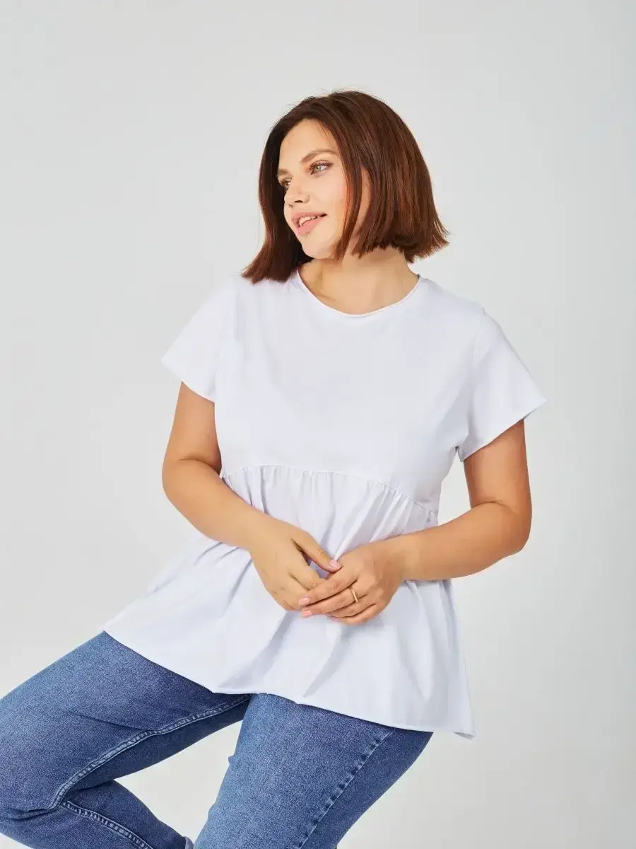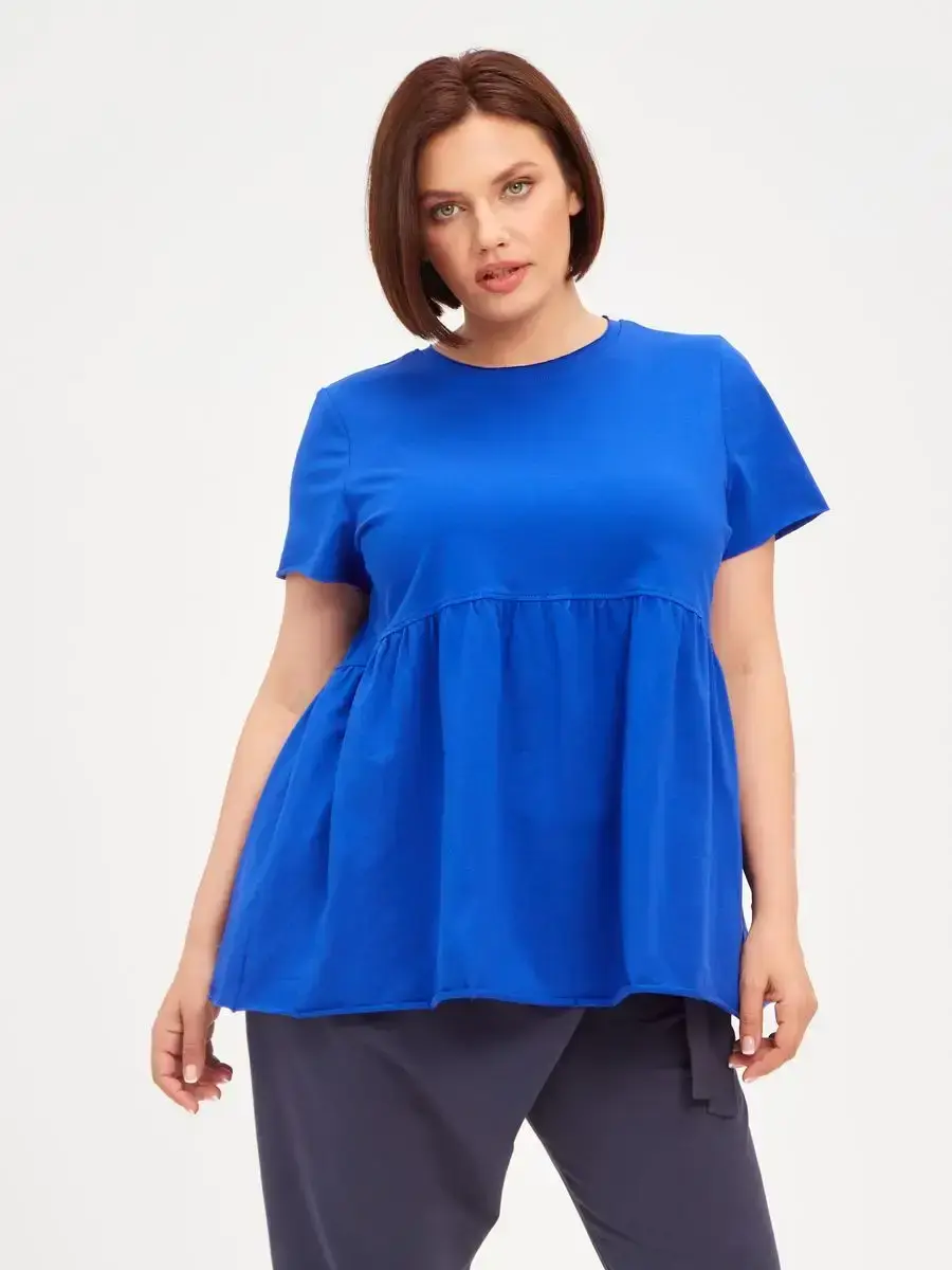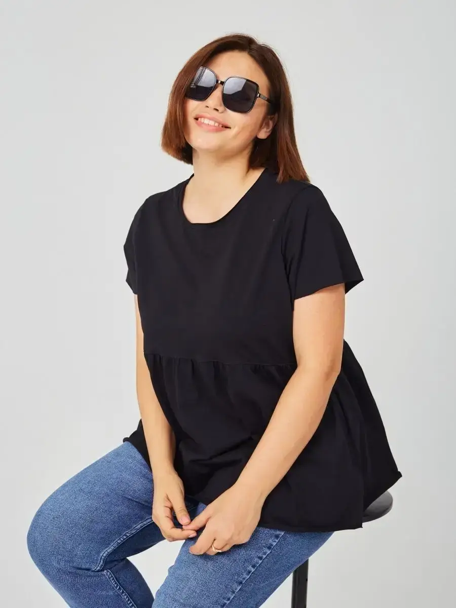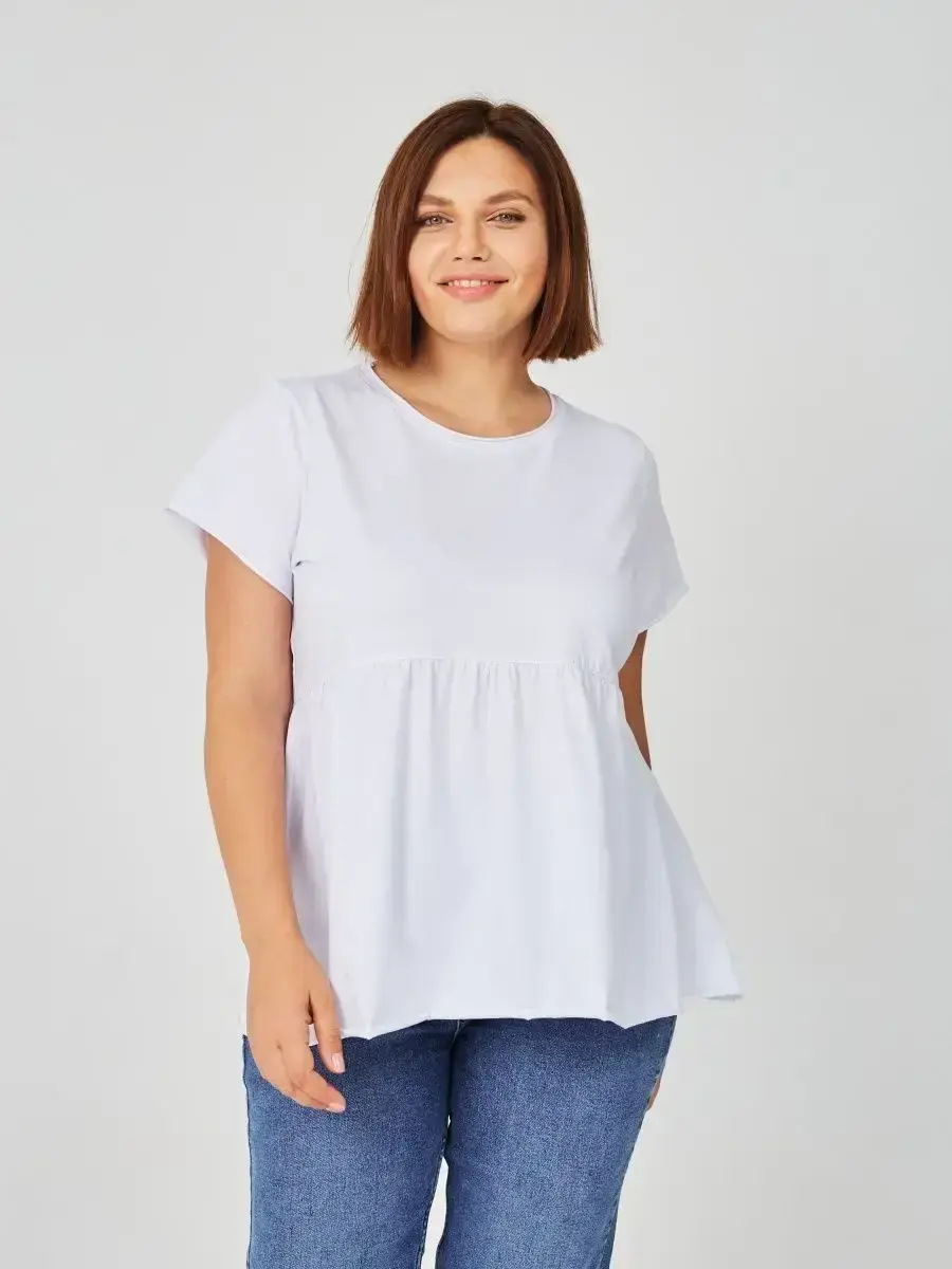 Женская летняя футболка с баской, округлым вырезом и коротким рукавом позволит вам выглядеть актуально всегда и везде. Однотонная футболка – женская базовая одежда для прогулок и офиса, которая отлично сочетается с любым низом. Свободный крой оверсайз при необходимости скроет несовершенства фигуры, а премиальный трикотаж из чистого хлопка обеспечит полный комфорт. Удлиненный хлопковый топ-блуза с баской – настоящая находка для женщин в ожидании чуда, а оригинальный силуэт oversize просто создан для обладательниц больших размеров. Прекрасный выбор на фотосессию для беременных