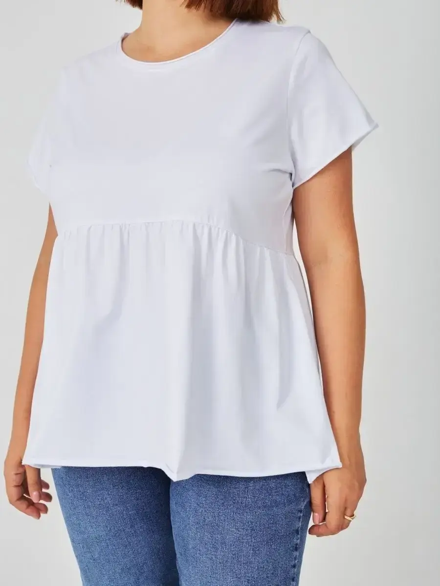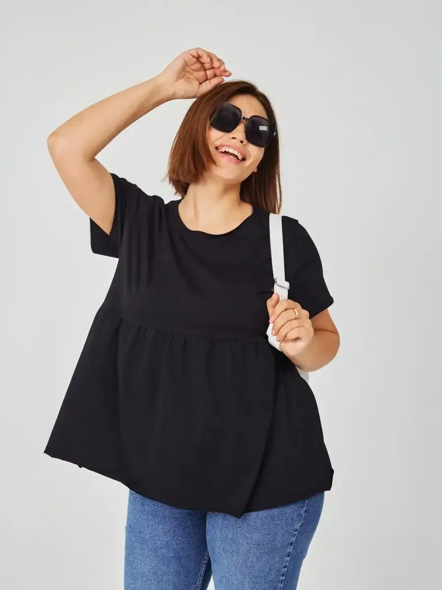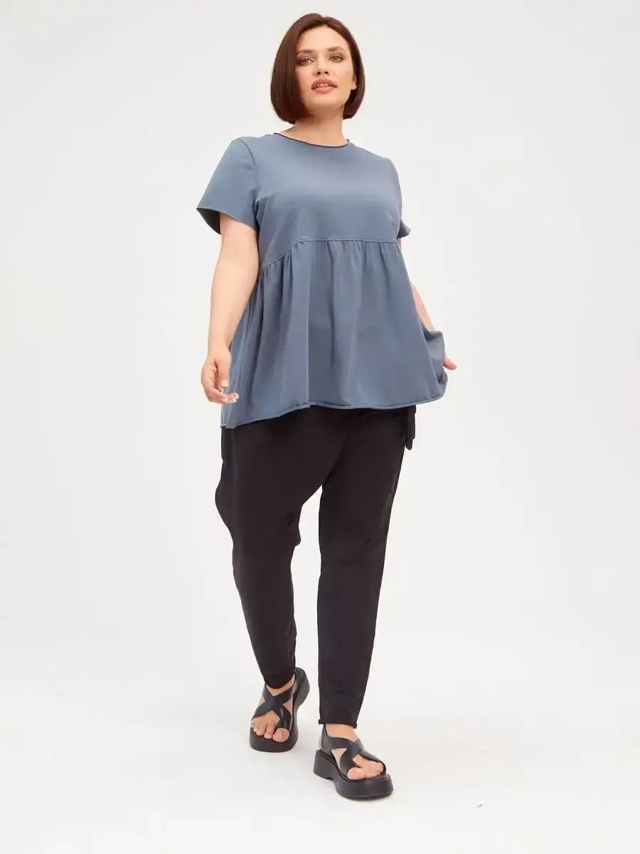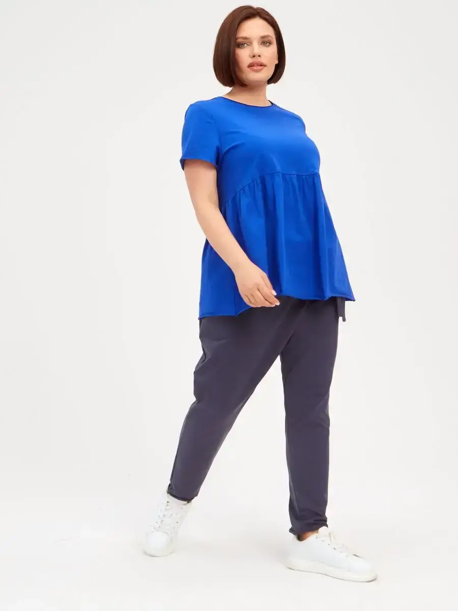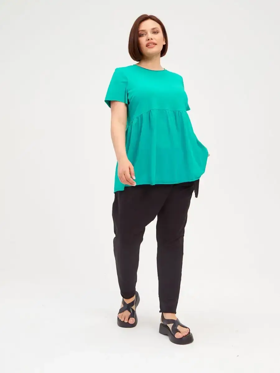 Женская летняя футболка с баской, округлым вырезом и коротким рукавом позволит вам выглядеть актуально всегда и везде. Однотонная футболка – женская базовая одежда для прогулок и офиса, которая отлично сочетается с любым низом. Свободный крой оверсайз при необходимости скроет несовершенства фигуры, а премиальный трикотаж из чистого хлопка обеспечит полный комфорт. Удлиненный хлопковый топ-блуза с баской – настоящая находка для женщин в ожидании чуда, а оригинальный силуэт oversize просто создан для обладательниц больших размеров. Прекрасный выбор на фотосессию для беременных