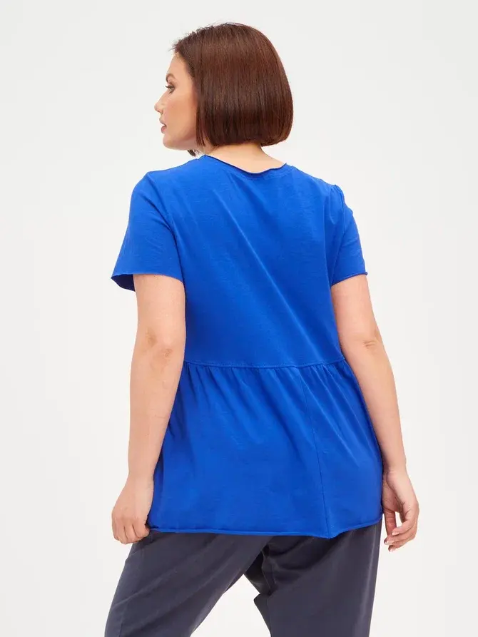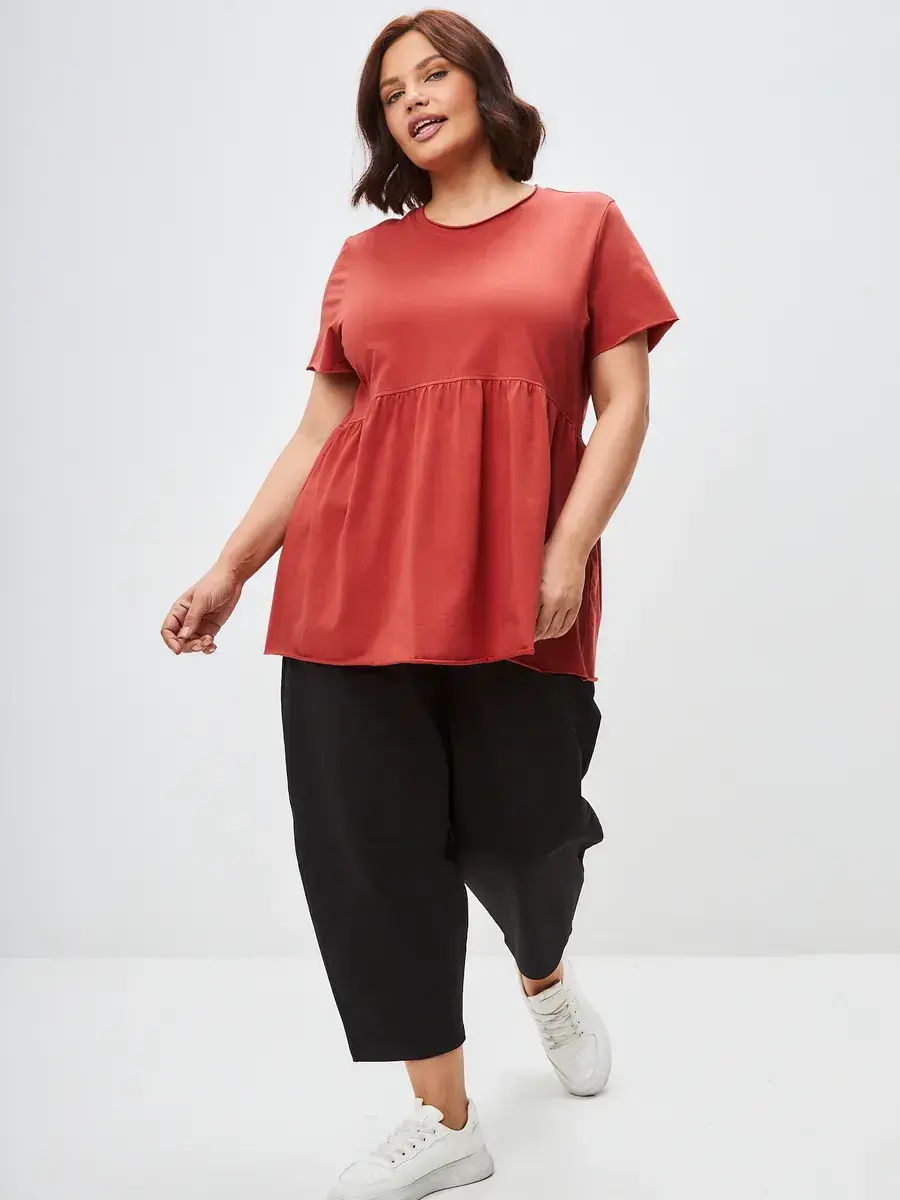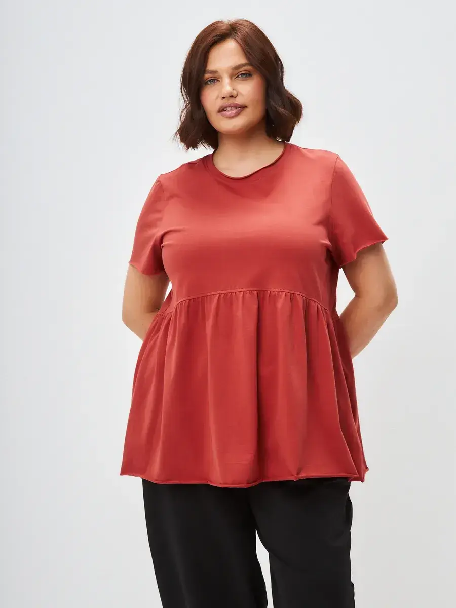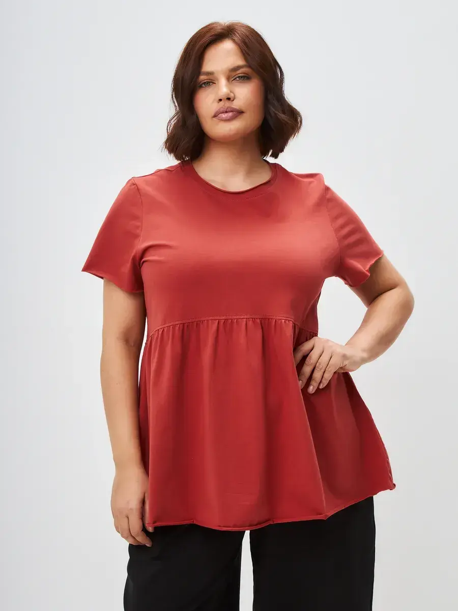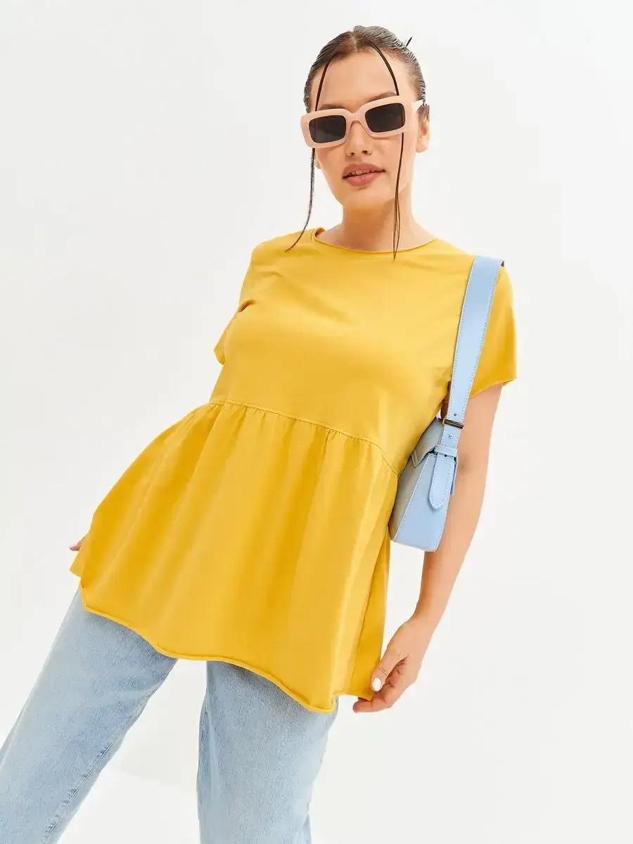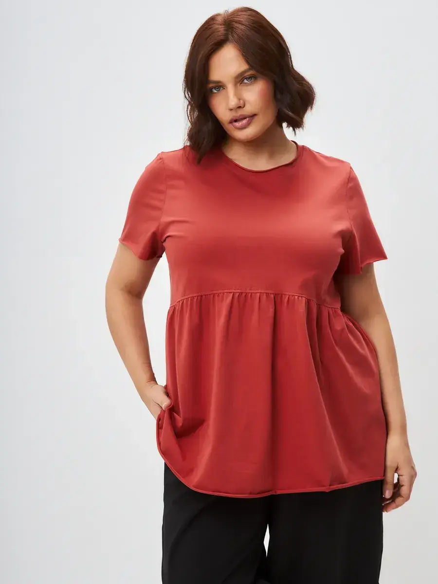 Женская летняя футболка с баской, округлым вырезом и коротким рукавом позволит вам выглядеть актуально всегда и везде. Однотонная футболка – женская базовая одежда для прогулок и офиса, которая отлично сочетается с любым низом. Свободный крой оверсайз при необходимости скроет несовершенства фигуры, а премиальный трикотаж из чистого хлопка обеспечит полный комфорт. Удлиненный хлопковый топ-блуза с баской – настоящая находка для женщин в ожидании чуда, а оригинальный силуэт oversize просто создан для обладательниц больших размеров. Прекрасный выбор на фотосессию для беременных