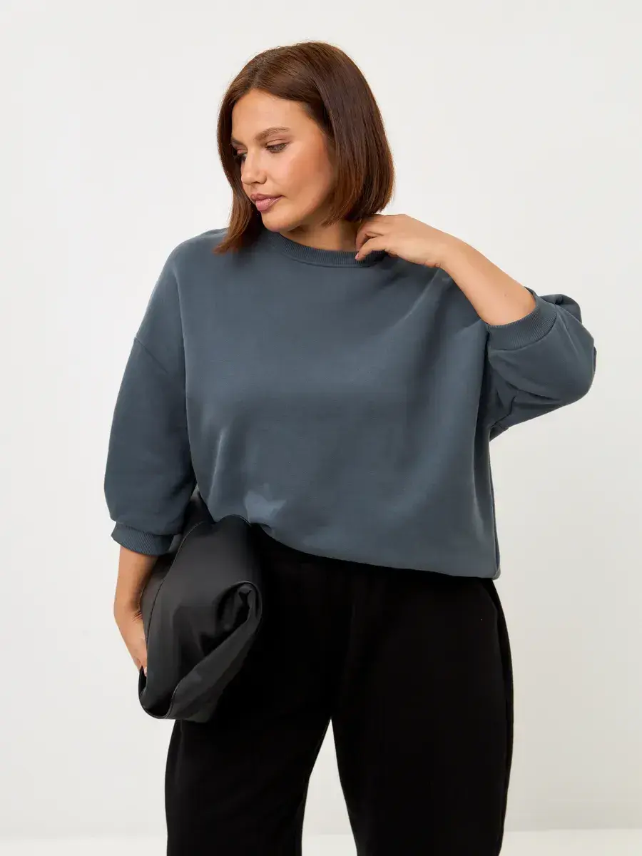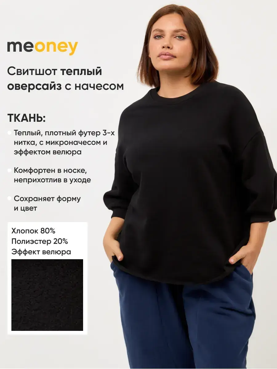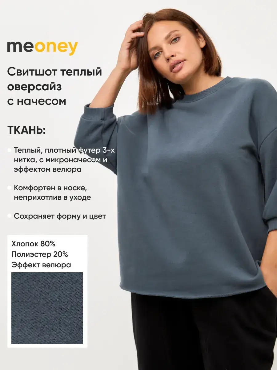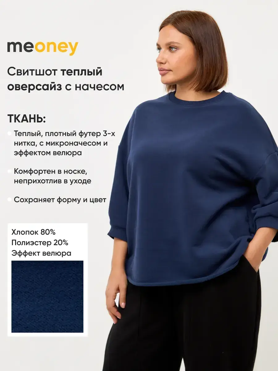 Внимание!!! При заказе рекомендуем использовать таблицу размеров размещенную на 5 фото! Дорогие дамы, рады представить для вас нашу новинку - Свитшот женский теплый с начесом. Модель свободной посадки за счет заниженной линии плеча и прямого кроя. Премиальное полотно с гладкой поверхностью снаружи, внутренняя с теплым начесом, что придает изделию мягкость и объём, а вам тепло и чувство бесконечного комфорта. Наш свитшот оверсайз отлично подойдет для зимних прогулок, повседневной носки и на работу, а также он согреет вас в холодные вечера дома. Для нашей толстовки без капюшона мы выбрали рукава 3/4, которые на протяжении нескольких десятилетий являются трендом во всех стилях и модных направлениях. Оверсайз крой нашего свитшота идеально подходит беременным и тем, кто нуждается в стильных вещах больших размеров.
